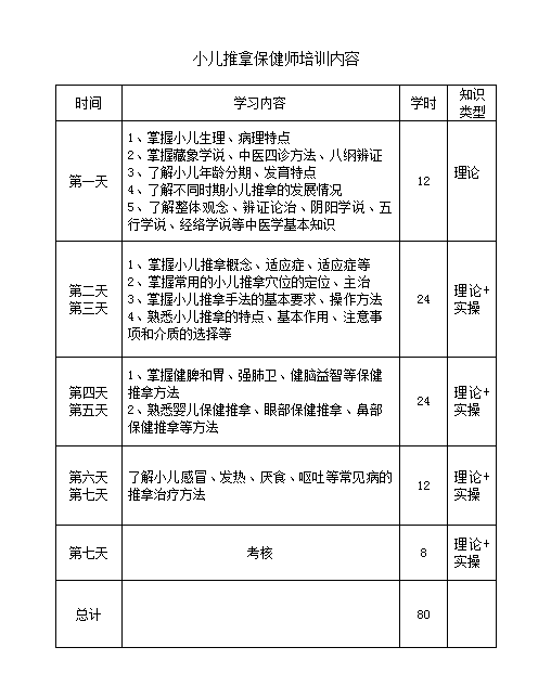 初級小兒推拿保健師培訓時間為7天,共80學時,保證學員學會小兒推拿保健基本理論和基本技能,培訓合格頒發烏蘭察布醫學高等??茖W校培訓合格證書。