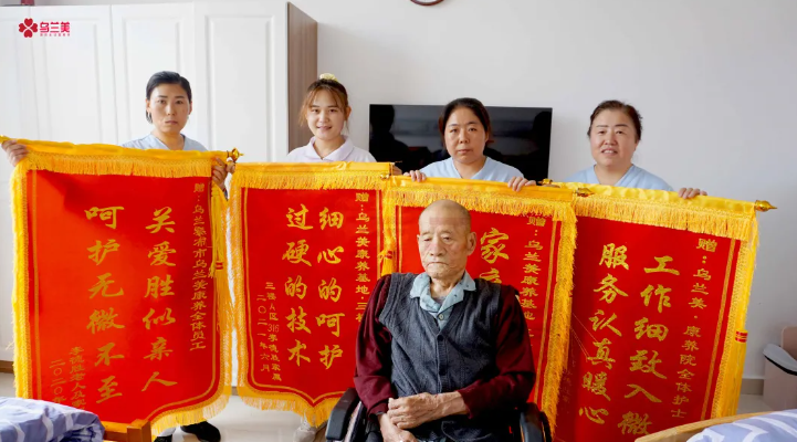 原來,李爺爺家屬口中的護士和護理人員們都在烏蘭美康養院工作,她們用過硬的專業知識和嫻熟的照護技能,對入院的長者進行專業護理,用細心、耐心、愛心、責任心陪伴左右,不怕苦、不怕累,盡職盡責的為長者緩解消除恐懼、焦慮和陌生感,減輕身心痛苦。她們待長者如親人的用心照料,讓李爺爺家屬十分感動,所以連送四面錦旗,以表誠摯的感謝。