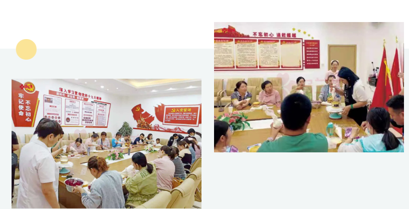 在烘焙師的指導下,大家認真學習制作蛋糕的技巧——摩拳擦掌,打奶油;躍躍欲試,搓餅干;專心致志,做花邊。大家紛紛自己動手,用打蛋器打出純滑扎實的奶油,裹在蛋糕胚上,涂抹轉刮,將切成塊的各種水果一層層疊加,隨后點綴鮮花,一個個色彩斑斕的蛋糕映入眼簾。不少準媽媽們將愛國主題元素融入到蛋糕中,既體驗到了制作蛋糕的快樂。又激發身邊人愛黨、愛國的情懷!