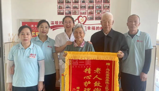 2022年4月11日上午,烏蘭美康養院B區三樓全體工作人員收到入住長者王興禮爺爺、于守珍奶奶夫妻倆的一面印有“老人致謝送錦旗,精心護理暖人心”的錦旗,以表達對全體工作人員的感激之情。